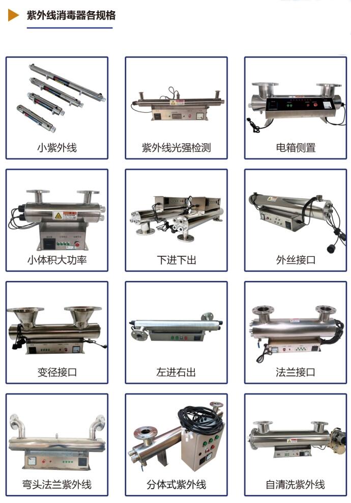紫外线消毒器装置,采用紫外线杀菌灯,具有广谱杀菌、水流均匀、无死角、光射条件好、杀菌彻底、能耗低、安装灵活方便等特点,主体材质采用不锈钢,紫外线灯管寿命长达12000小时简体内壁经过特殊处理的食品级304不锈钢,使经过预处理的水流过筒体时受到波长253.7nm紫外线足够量的照射,具有良好的杀菌效果.