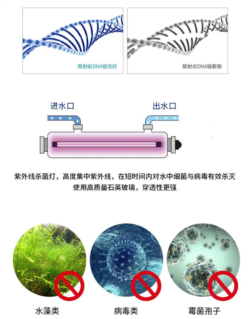紫外线消毒器(紫外线杀菌器,紫外线消毒仪)的杀菌原理是利用紫外线光子的能量破环水体中各种病毒、细菌以及其它致病体的DNA结构。主要是使DNA中的各种结构键断裂或发生光化学聚合反应,例如使DNA中THYMINE二聚,从而使各种病毒、细菌以及其它致病体丧失复制繁殖能力,达到灭菌的效果。