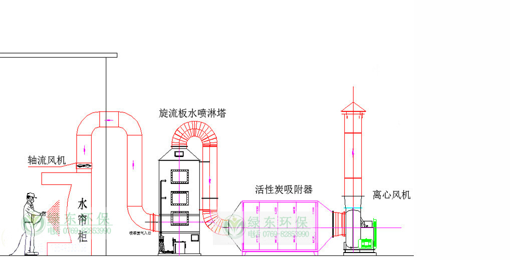 东莞喷漆废气处理(水喷淋 + 活性炭吸附)。喷漆废气的主要成分是有机废气和颗粒物,废气经由风管进入喷淋塔内部,在塔内去除粉尘和颗粒物,并进行干燥处理后,进入后续的二级活性炭吸附塔中进一步处理,最终实现达标排放。喷漆废气处理的简要流程为:喷漆废气→水帘柜→风管收集→水喷淋塔→二级活性炭吸附塔→达标排放