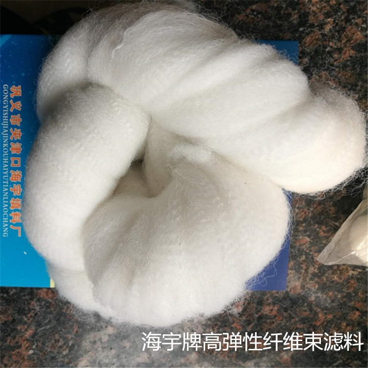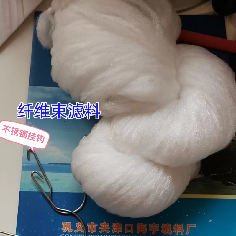 用于水处理的纤维束是有原油经过提炼制作成聚酯切片再经恒温拉丝机拉成的聚酯长丝。或丙纶膨化变形长丝经缠绕制作成具有一定长度,一定重量的环形纤维组合。再经恒温膨化定型制成。又叫束状纤维软填料。