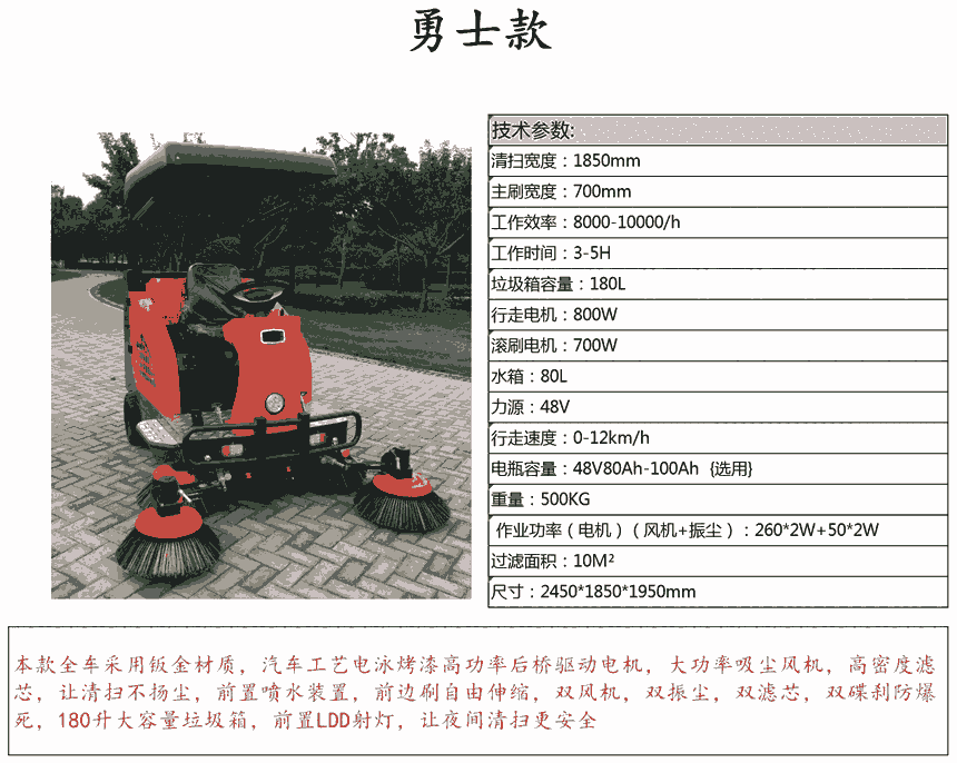 1850型全封闭驾驶式扫地机是扫地、喷水、吸尘相结合的自动半封闭驾驶式清洁能源综合机器。
