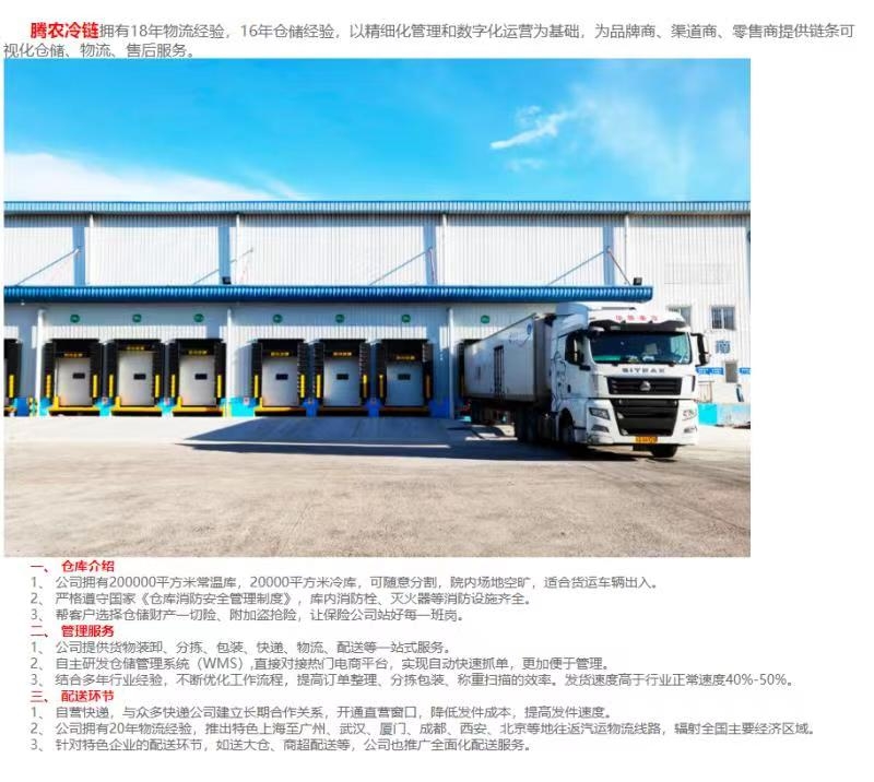 上海腾农冷链物流有限公司是一家新起的专业低温冷链物流公司,虽然成立不久,但是管理团队拥有多年的市场及运营经验,总经理曾就职于中国知名的冷链物流公司,拥有非常丰富的市场及运营经验,操作过很多知名品牌的仓储,城市配送,华东运输及全国运输业务。