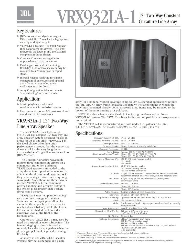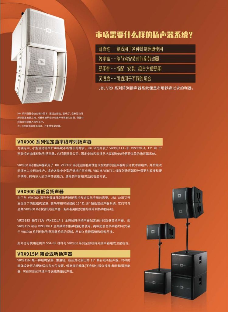 VRX900 系列扬声器采用了 JBL 著名的 VERTEC 系列远投射高性能大型线阵列扬声器的设计技术和优秀组件,并按照世界流动演出工业标准生产。非常完美地适合各类中小型厅堂地扩声应用。VRX 比 VERTEC 线阵列扬声器设计得更为紧凑和便于携带,拥有惊人的功率传送能力,清晰的声音和灵活的安装方式。