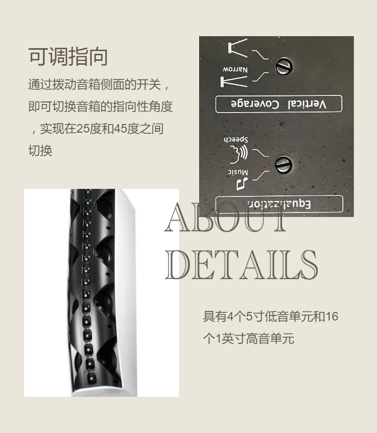 产品描述:由16个1英寸高音单元,4个5英寸低音单元组成的 70厘米J型同轴线阵列,带恒定波宽电路