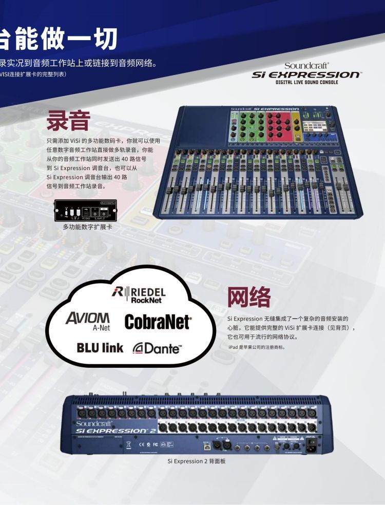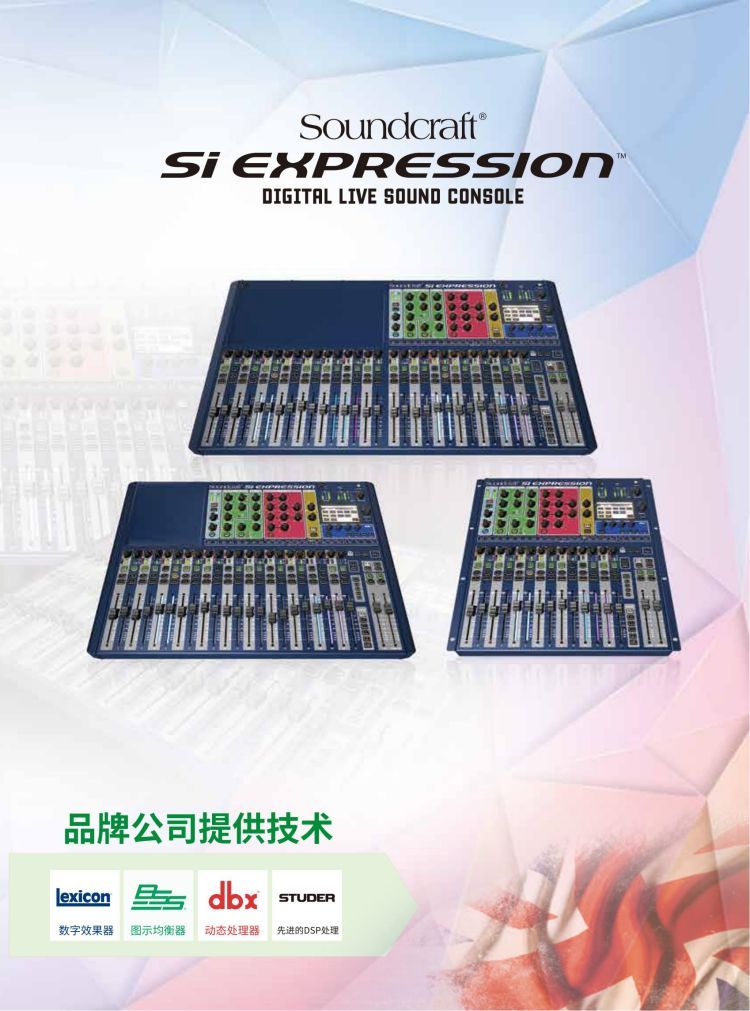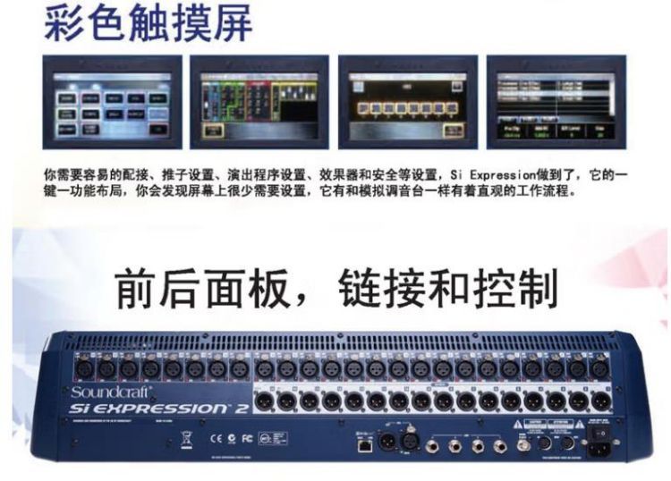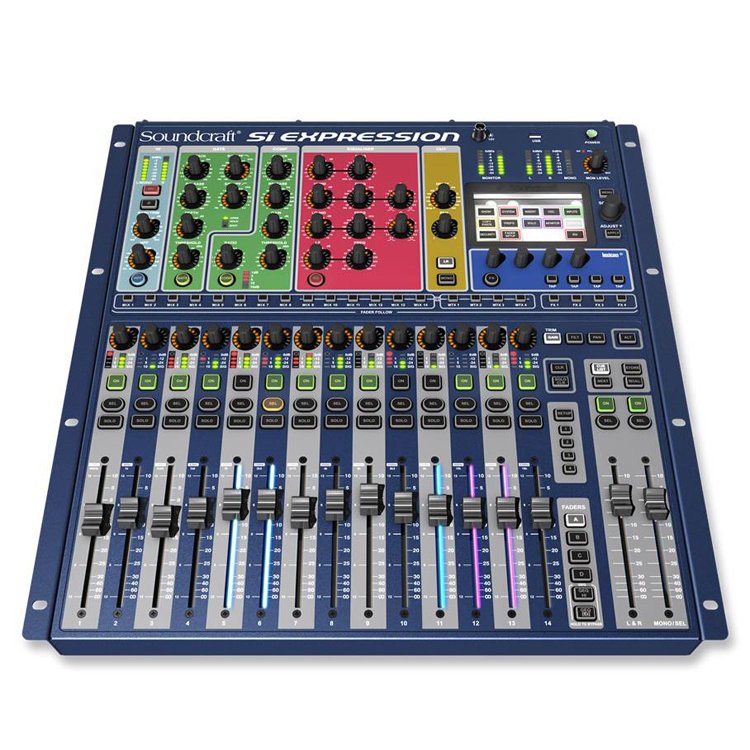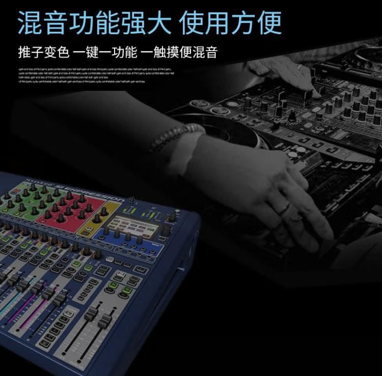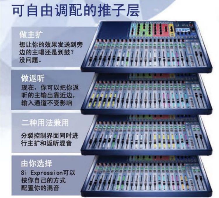 具有Soundcraft FaderGlow?功能,每个推子插槽对应的功能,包括 FX,立体声,连接单声道,GEQ,推子后辅助,推子前辅助均配有各种颜色的指示灯