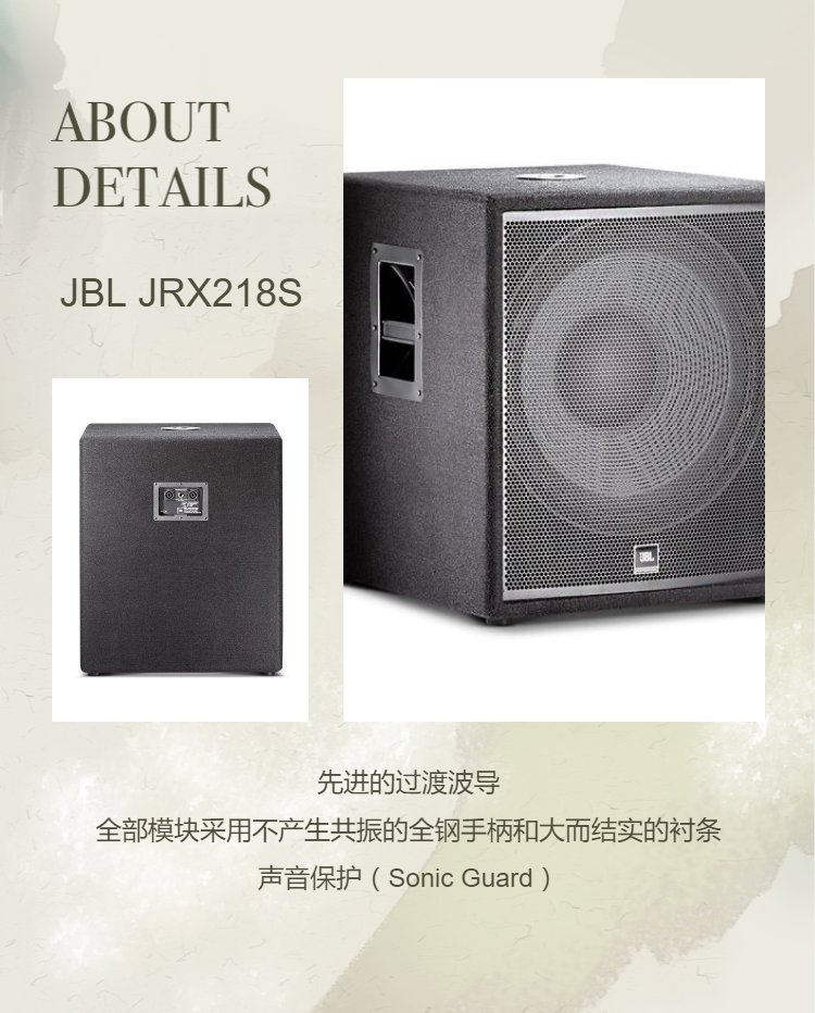 JRX218S是一个巨大的、 采用3"音圈的JBL 18"低音扬声器驱动, 额定功率(连续功率)为350W, 峰值功率为1400W。 这是根据JBL 100小时苛刻测试确定的。
