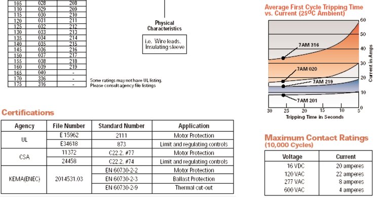 ●?每一个?7AM?温度规格都有经过特别制造的双金属簧片所保证。每个保护器断开温度都要校正和检验,在所要求的循环寿命中,器件必须要提供最佳的断开和复位性能,从而达到使之连续可靠的工作目的。