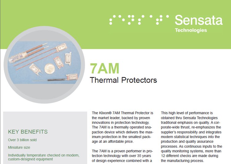 ●7AM?热保护器是美国德州仪器?Klixon?专有技术生产的,用于精确控制(电器、电机 )的过热和过载的保护元件。