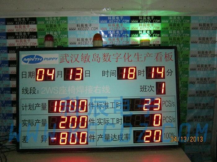9.其他功能:看板内置时段管理功能,可设置任意时刻暂停或启动,可设置自动清0或赋值(如每日生产8点前实际产量数自动清0,早中晚班计划数量自动切换,生产休息时间自动开始暂停等) 可以设置30个时段;看板上所有数据(除点阵上的文字)均可由现场遥控器修改。