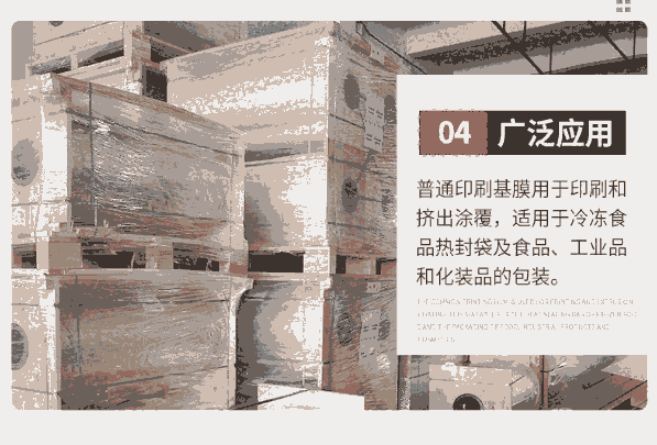 产品应用:普通印刷基膜用于印刷和挤出涂覆,适用于冷冻食品热封袋及食品、工业品和化装品的包装。