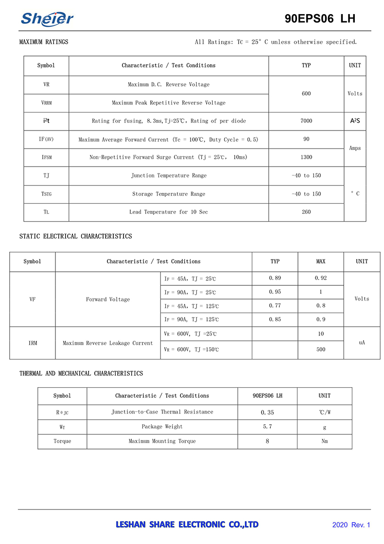 sheier/乐山希尔 全新原厂原装普通整流二极管:90EPS06 LH;正向整流电流:90A;反向峰值电压:600V;封装方式:TO-247AC。通用电源、电器、适配器、充电器、充电桩、工控、医疗设备、工业特种电源、高频电源、风光储新能源、逆变器、伺服电机马达等产品电路作整流、续流、开关、钳位、防反接、防回流等作用。GPP大芯片高电压大电流大功率插件式通用常规标准二极管90EPS06 LH。