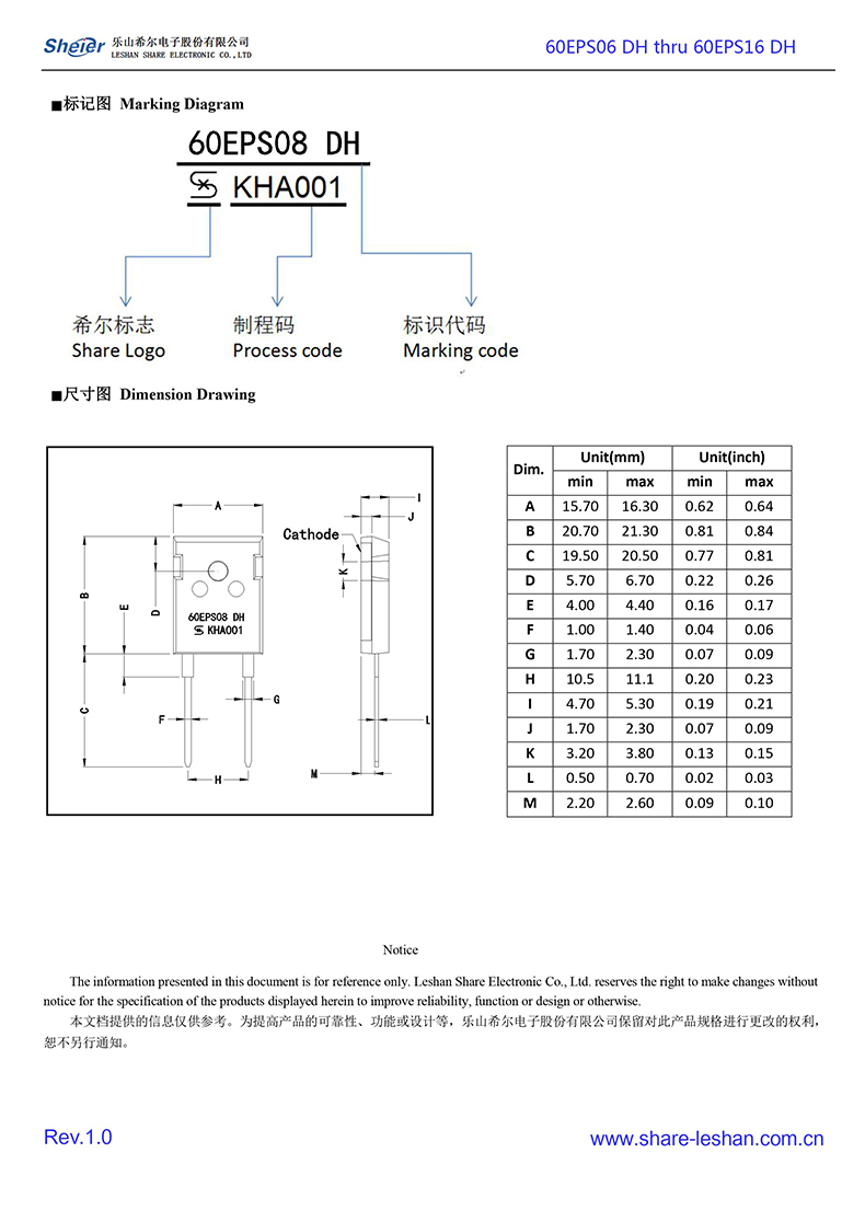 sheier/乐山希尔 全新原厂原装普通整流二极管:60EPS16 DH,60EPS14 DH;正向整流电流:60A;反向峰值电压:600V~1600V;封装方式:TO-247AC。通用电源、电器、适配器、充电器、充电桩、工控、医疗设备、工业特种电源、高频电源、风光储新能源、逆变器、伺服电机马达等产品电路作整流、续流、开关、钳位、防反接、防回流等作用。GPP大芯片高电压大电流大功率插件式通用常规标准二极管60EPS16DH/60EPS14DH。