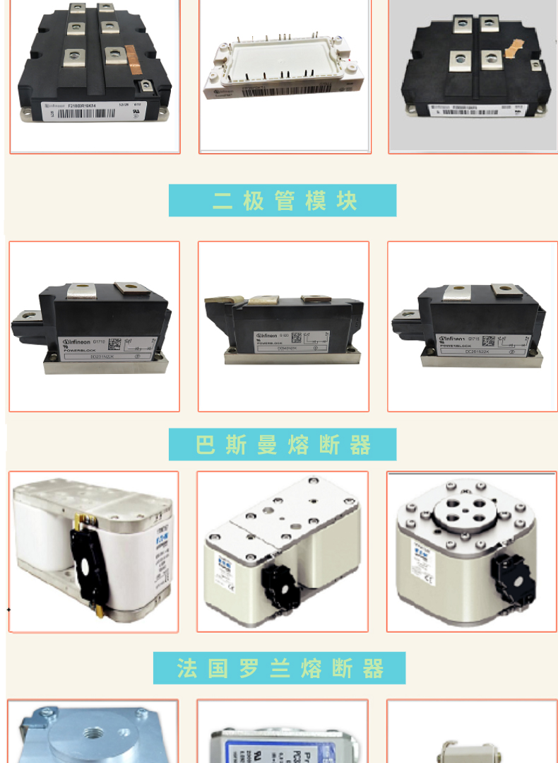 公司主营原装进口电子元器件:Infineon/英飞凌,Semikron/西门康,IXYS/艾赛斯,SANREX/三社,FUJI/富士,Mitsubishi /三菱,Westcode/西玛,美国IR 、Microsemi/美高森美快恢复二极管、整流桥,IGBT模块、可控硅晶闸管;Siemens/西门子,Bussmann/巴斯曼,Ferraz/罗兰 、Hinode/日之出、茗熔等厂家熔断器,本公司商品均为正品,实物实拍,优势现货,大量库存~品种齐全、价格优惠、欢迎咨询!!
