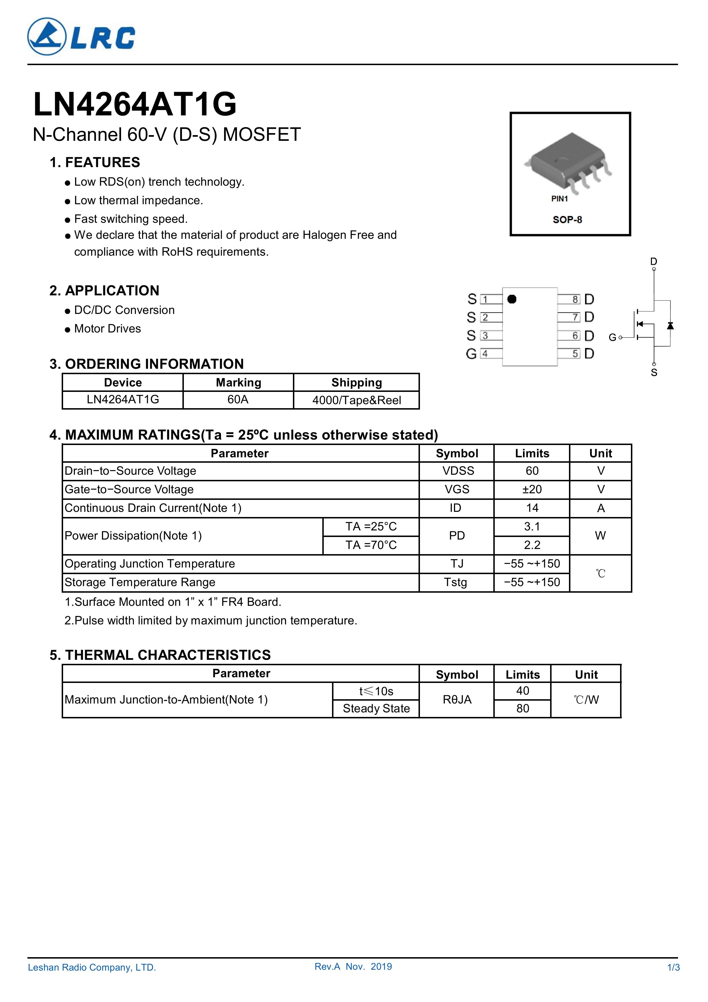 LN4264AT1G/60A 大芯片中低电压大电流低内阻低漏电的分立式功率整流晶体开关管。本品采用内置大尺寸芯片,漏极3脚位源极4脚位,支持多路输入 输出贴片式封装,,具有适应中低电压低内阻损耗高频高效恢复快等电气特性特点。通用于电源、小家电、锂电池、马达电机、电动工具、无人机、电器、适配器、充电器、逆变器、充电桩、特种电源、高频电源、风光储新能源、医疗设备、工业工控等产品电路作电子开关、控制、整流、放大、钳位、防反接、防逆回流等作用。