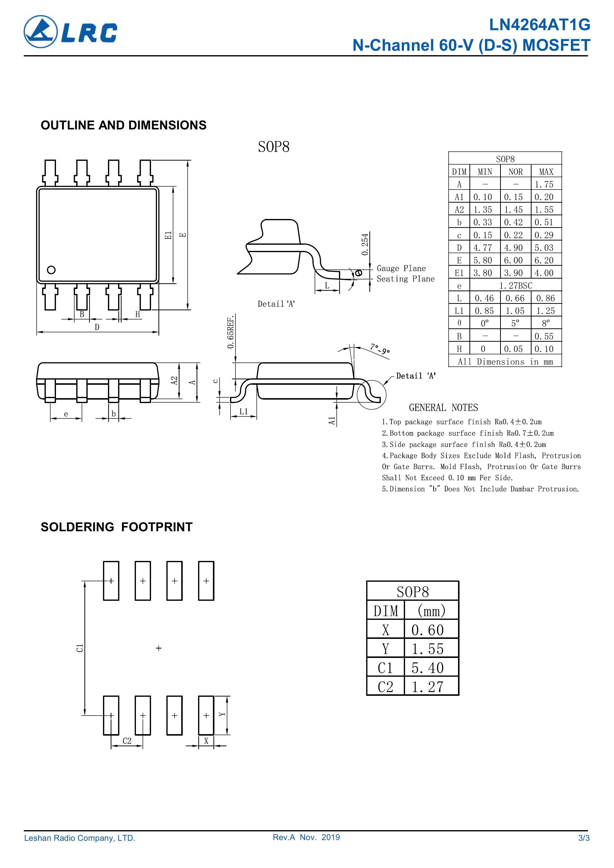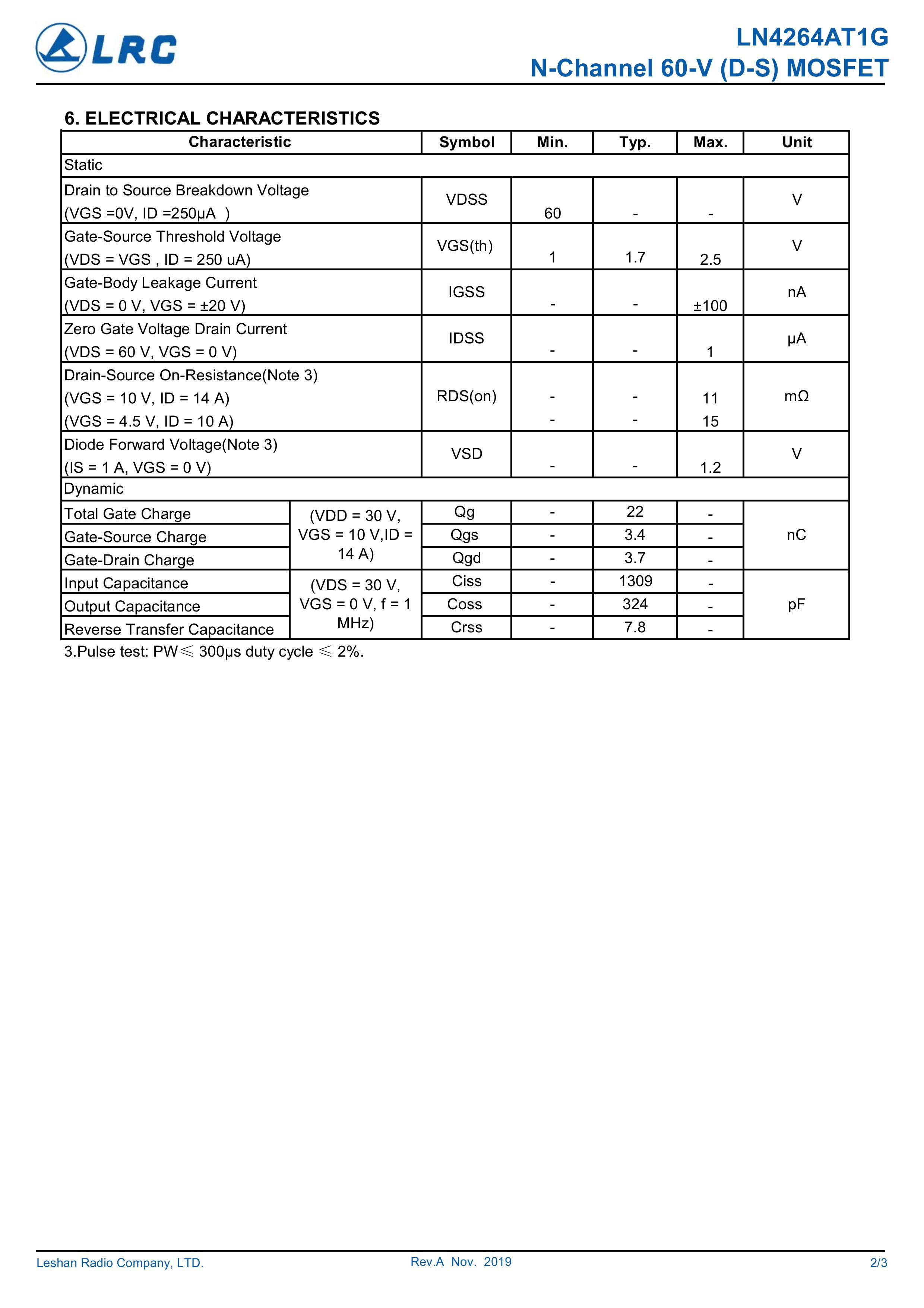 LRC/乐山无线电 LN4264AT1G/60A 全新原厂原装中低压高频分立功率器件电子开关场效应管,多路源极漏极N型沟道场管60V、14A、15mΩ、N-Channel、贴片式中低压MOSFET: LN4264AT1G/60A。Vds电压:60V;Id电流:14A;Rds(on)内阻:15mΩ;封装方式:SOP-8;最小包装数量:4000pcs/盘-编带。