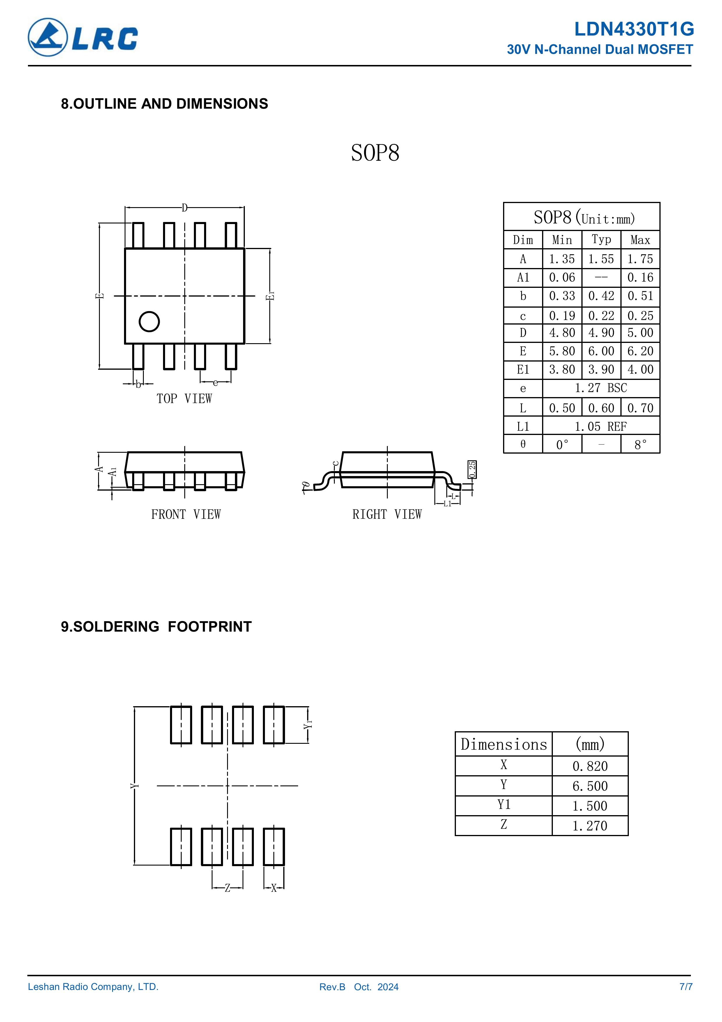 LDN4330T1G/4330 双芯片中低电压大电流低内阻低漏电的分立式功率整流晶体开关管。本品采用内置两颗大尺寸芯片,栅极2、4脚位,源极1、3脚位,漏极5~8脚位,支持多路输入输出贴片式封装,,具有适应中低电压低内阻损耗高频高效恢复快等电气特性特点。通用于电源、小家电、锂电池、马达电机、电动工具、无人机、电器、适配器、充电器、逆变器、充电桩、特种电源、高频电源、风光储新能源、医疗设备、工业工控等产品电路作电子开关、控制、整流、放大、钳位、防反接、防逆回流等作用。