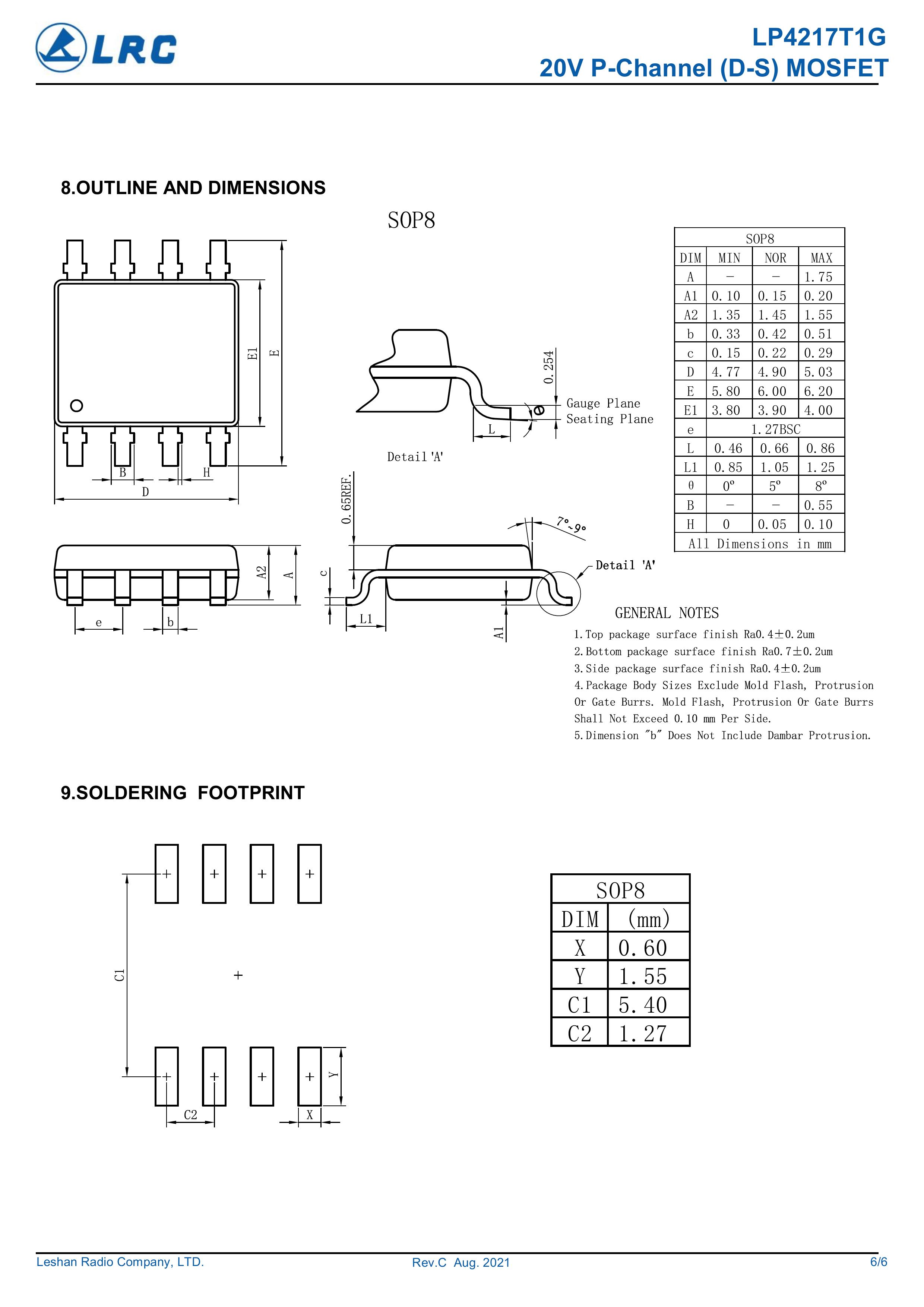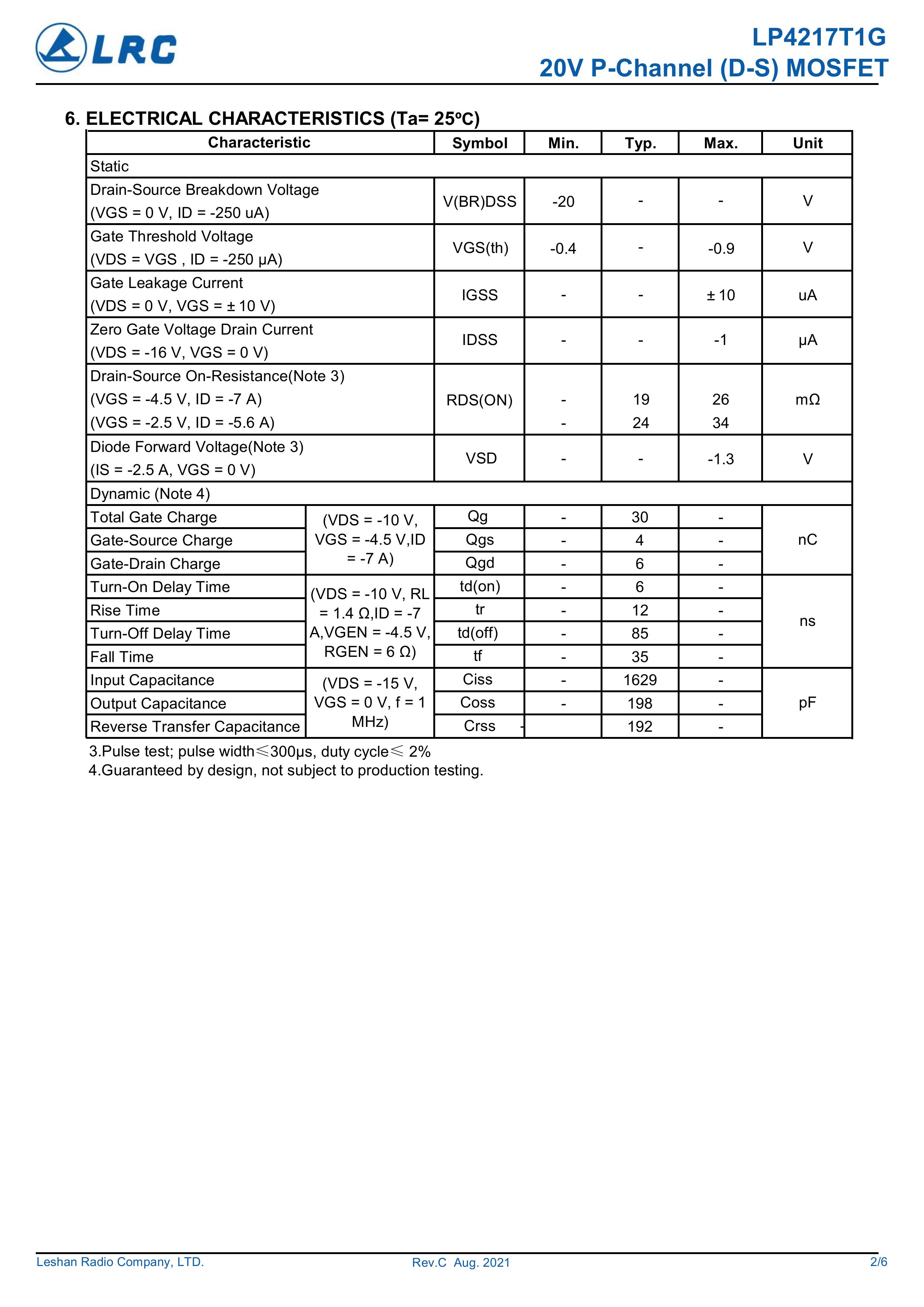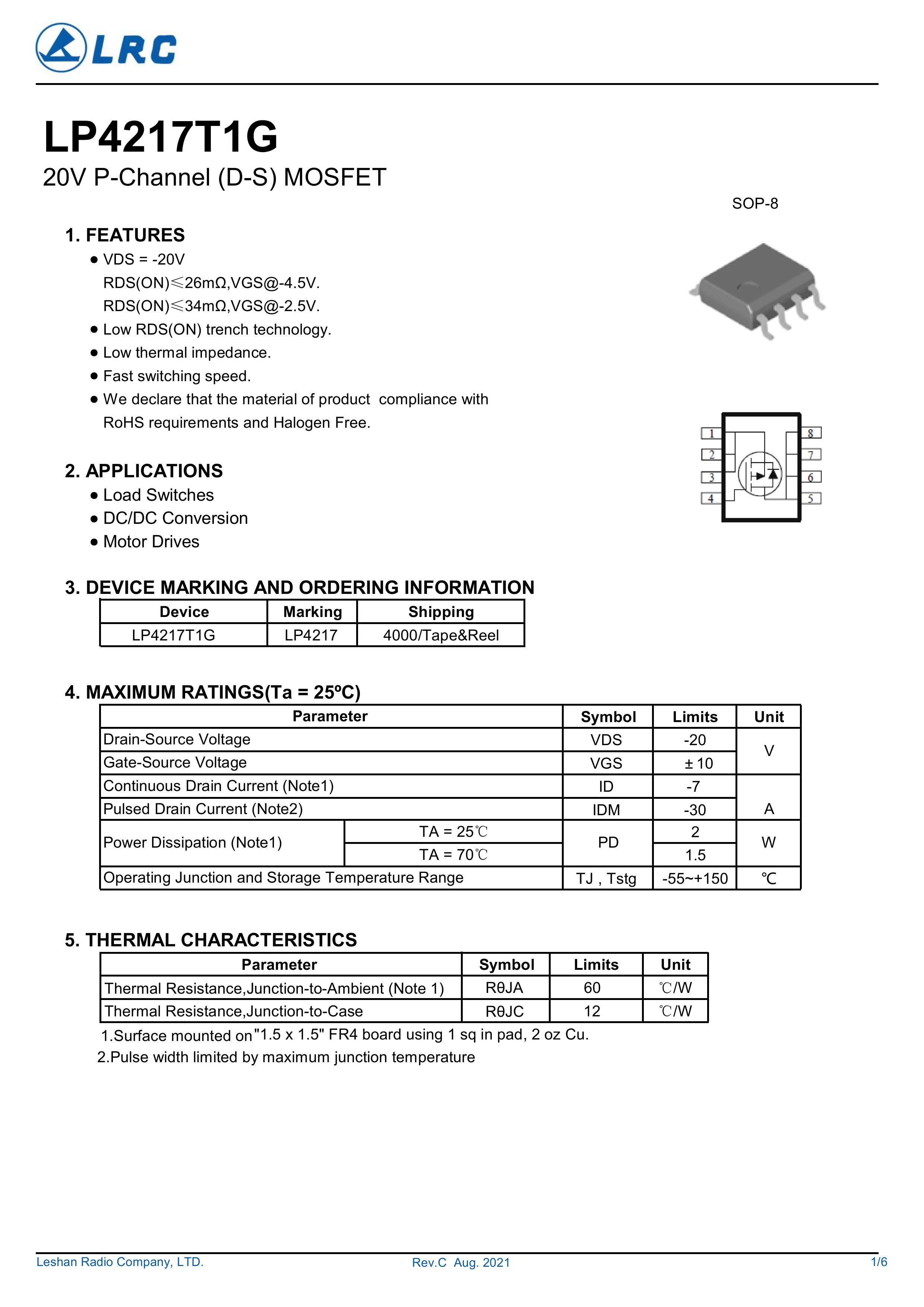 LRC/乐山无线电 LP4217T1G/LP4217 全新原厂原装中低压高频分立式功率器件电子开关场效应管,P型沟道场效应管负电压-20V、-7A、26mΩ、P-Channel、贴片式中低压MOSFET: LP4217T1G/LP4217。Vds电压:-20V;Id电流:-7A;Rds(on)内阻:26mΩ;封装方式:SOP-8;最小包装数量:4000pcs/盘-编带。