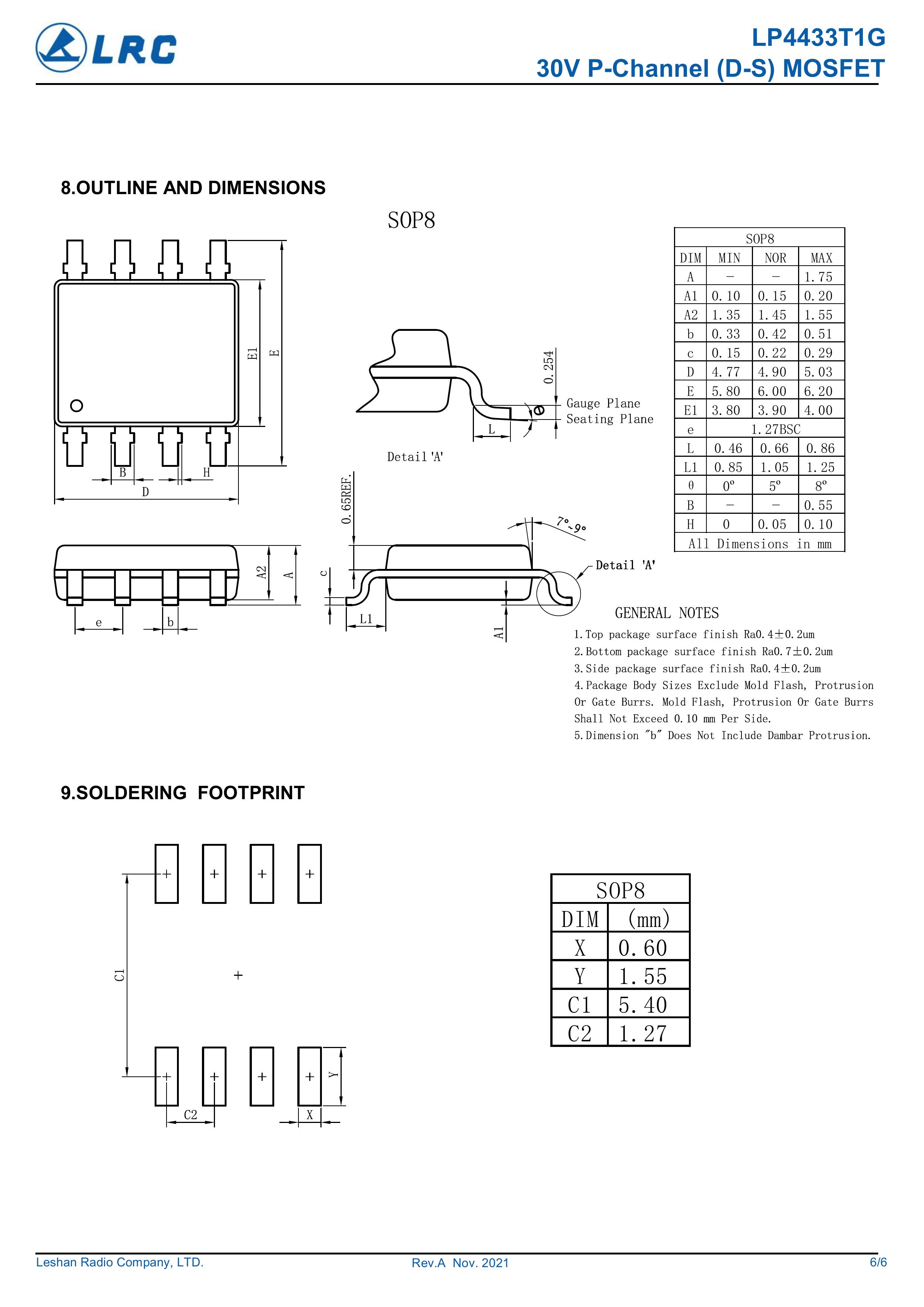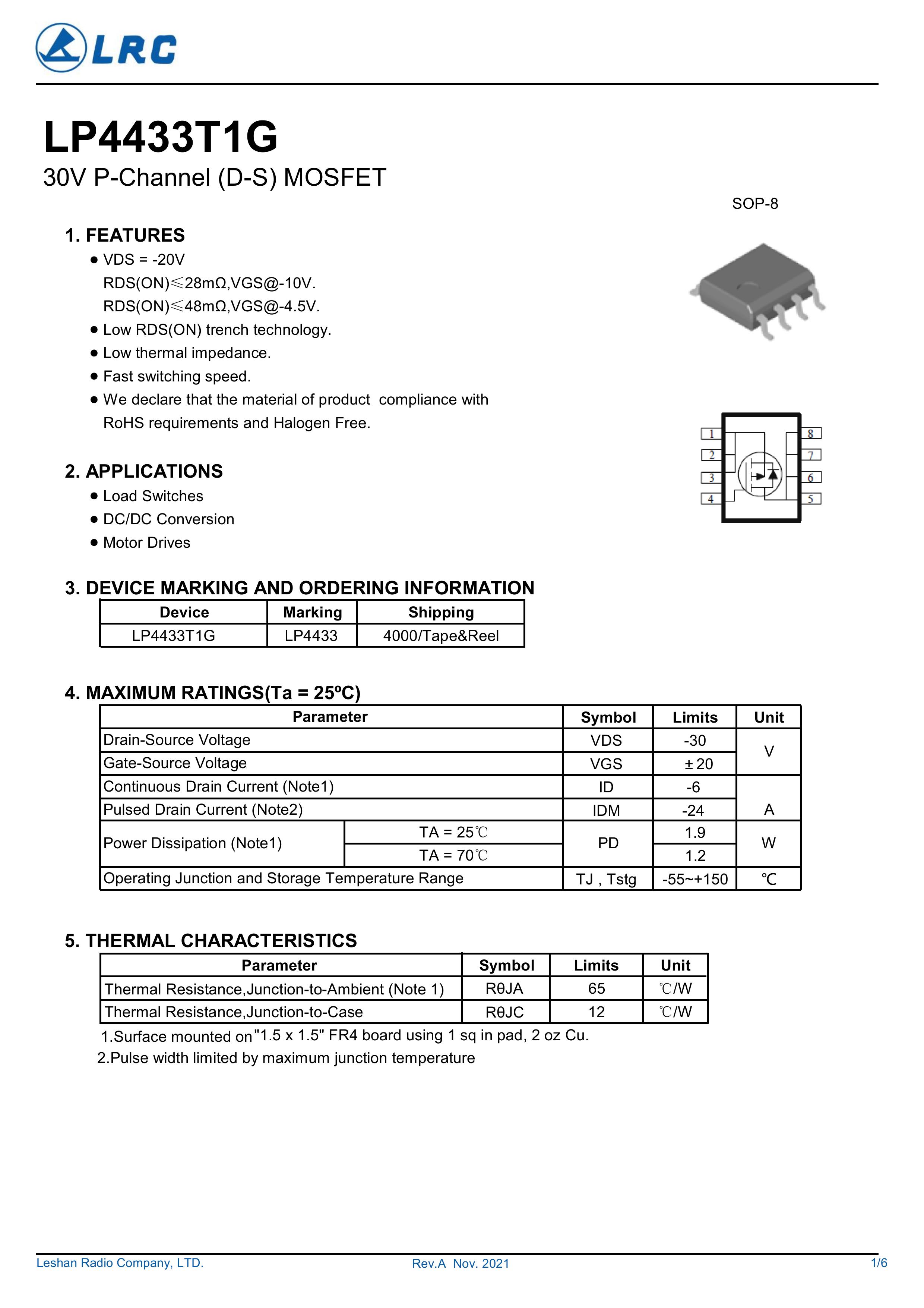 LRC/乐山无线电 LP4433T1G/LP4433 全新原厂原装中低压高频分立式功率器件电子开关场效应管,P型沟道场效应管负电压-30V、-8A、48mΩ、P-Channel、贴片式中低压MOSFET: LP4433T1G/LP4433。Vds电压:-30V;Id电流:-8A;Rds(on)内阻:48mΩ;封装方式:SOP-8;最小包装数量:4000pcs/盘-编带。