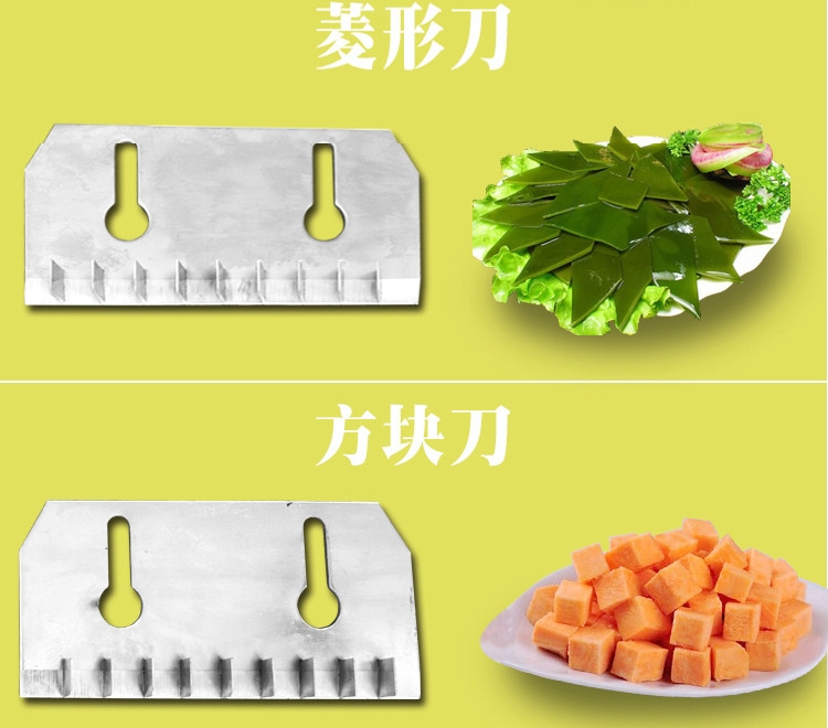 本机适用于硬、软各种根、茎、叶类蔬菜和海带的加工,可切制成片、块、丝、丁、菱形、曲线形多种花样。