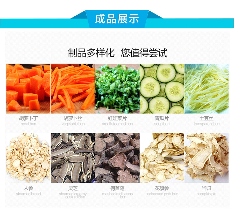 4、芦荟粒、芦荟条。改变切刀与送料槽安装角度为专斜切机将根茎类蔬菜:如马铃薯、蕃薯、黄瓜、竹笋、洋葱、茄子等切片、条、丁,适合卫生餐饮人员或食品加工厂使用.用途:叶菜类:可切芹菜、大白菜、高丽菜、菠菜、葱、大蒜、瓜类等长条状之物切成片、丝、段状,适合食品加工业者配合自动化生产线。