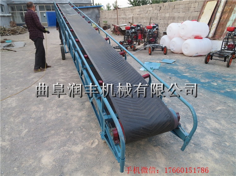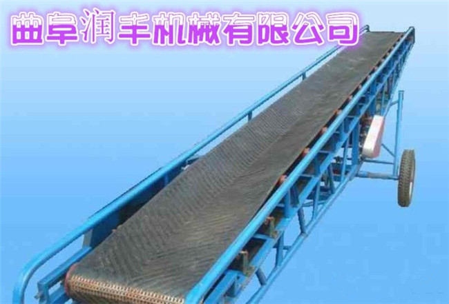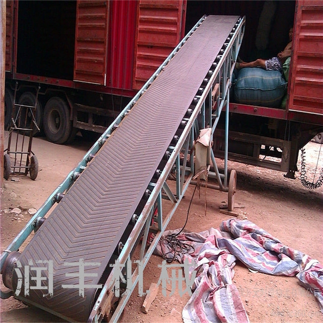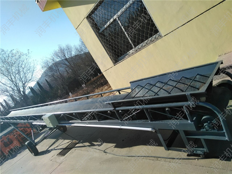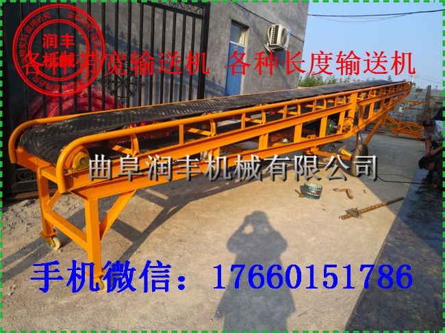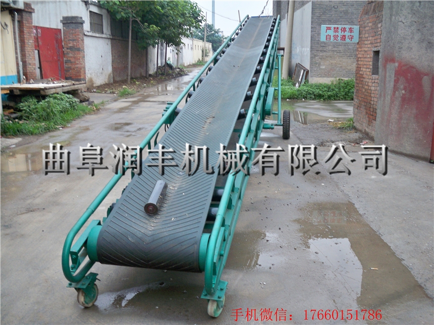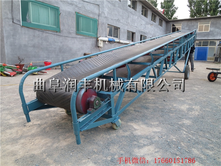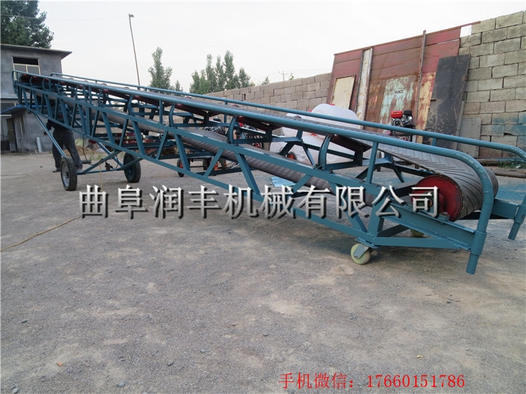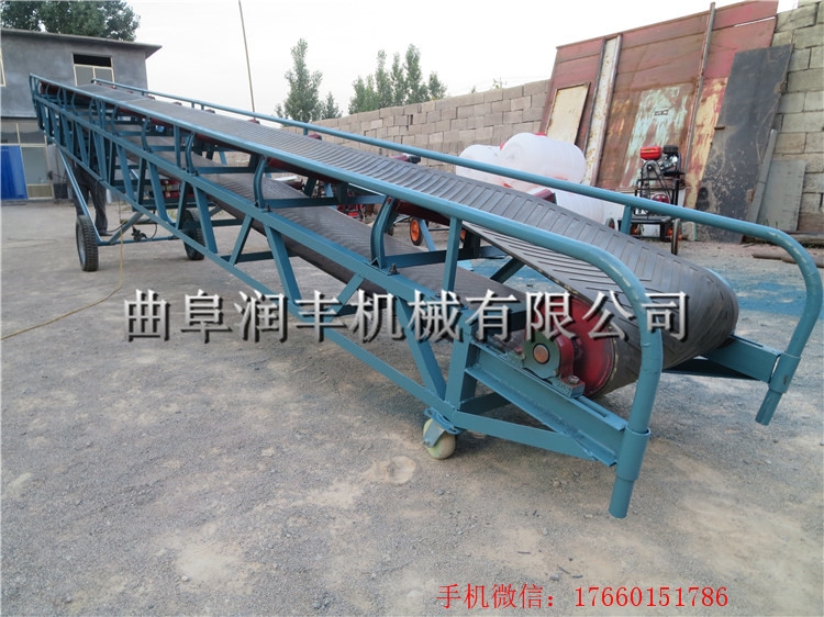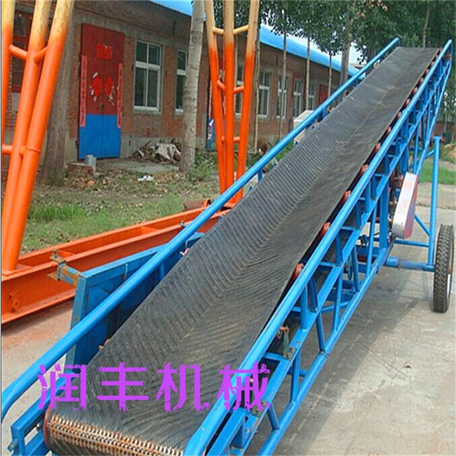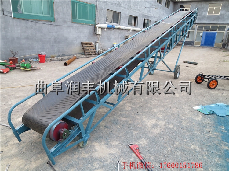 装车卸车用移动带升降皮带输送机不限制使用场地,皮带机下面带有轮子,可来回移动、是一种较方便 的装、卸车用的带式输送机,装卸小麦、玉米、大豆等散装、袋装等不规则物体,升降带移动代替了人工装卸车,提高了工作效率。