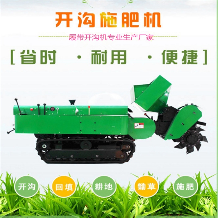 履带开沟施肥机是一款多功能田园果园管理机械;特点是开沟施肥/回填自动化一次性完成!固态化肥(颗粒/粉末);有机肥/厩肥都可以实现自动化完成。也可以单独开沟二次回填,还可以装配/旋耕犁/锄草机具!由于农家肥和化肥的肥料性质差别很大,这种开沟施肥机是您的选择!这种开沟施肥机的工作原理是由双叶片的螺旋式推进器横向将肥料排出下落到沟里;在整个机器开沟幅宽内均匀施肥。