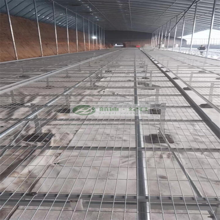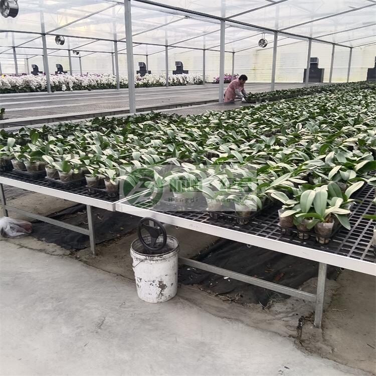 温室苗床分为固定式苗床和移动式苗床,固定式苗床为单层苗床,高度不可调整,采用热镀锌角钢或矩形管作为骨架,床面铺设钢丝网。移动式苗床采用热镀锌管材,边框采用铝合金,苗床网表面热镀锌防腐处理,高度可微调,具有防侧翻装置,且可在任意两苗床之间产生适当宽度作业通道。