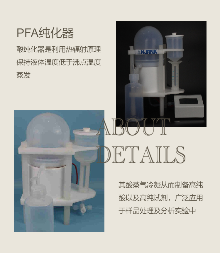 1.设备主体由高纯度的PTFE和PFA制造而成,与酸试剂接触容器采用进口PFA材质,本底更低,无腐蚀,无污染;