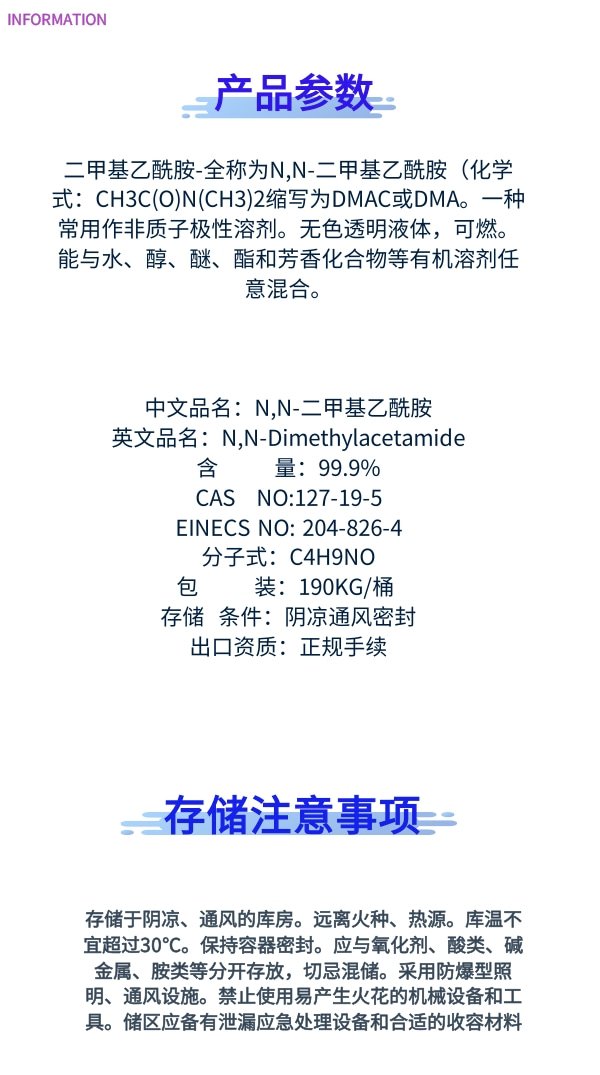 2. ;DMAC主要用作合成纤维(丙烯腈)和聚氨酯纺丝及合成聚酰胺树脂的溶剂.