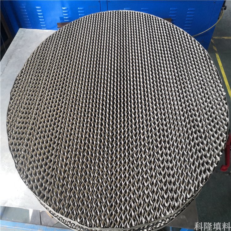 金属孔板波纹填料是在金属薄板表面打孔、轧制小纹、后组装而成,具有阻力小气液分布均匀,效率高,通量大,放大效应不明显等特点,应用于负压,常压和加压操作。用金属孔板波纹填料改造板式塔效果尤为明显。加工填料的塔径范围为φmm-12000mm以上。