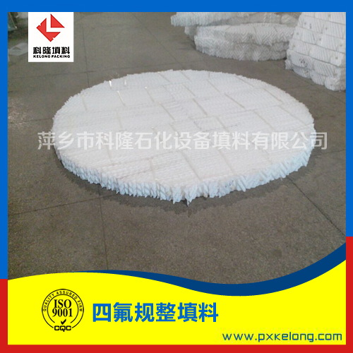 聚四氟乙烯/PTFE孔板波纹填料主要性能:在填料片上开有小孔,具有大能量、低压降和高的比表面积,在提高产量,降低能耗,提高效率上有较大的优势。同时由于填料的有序排列,物料中含有的固相颗粒可通过填料的波纹底排出,因此抗堵性能优良,操作弹性比一般通用塔器大,取代散装塔填料,可提高生产能力5%,提高生产效率50%。同时具有质轻、价廉的特点,适用大容积塔器。