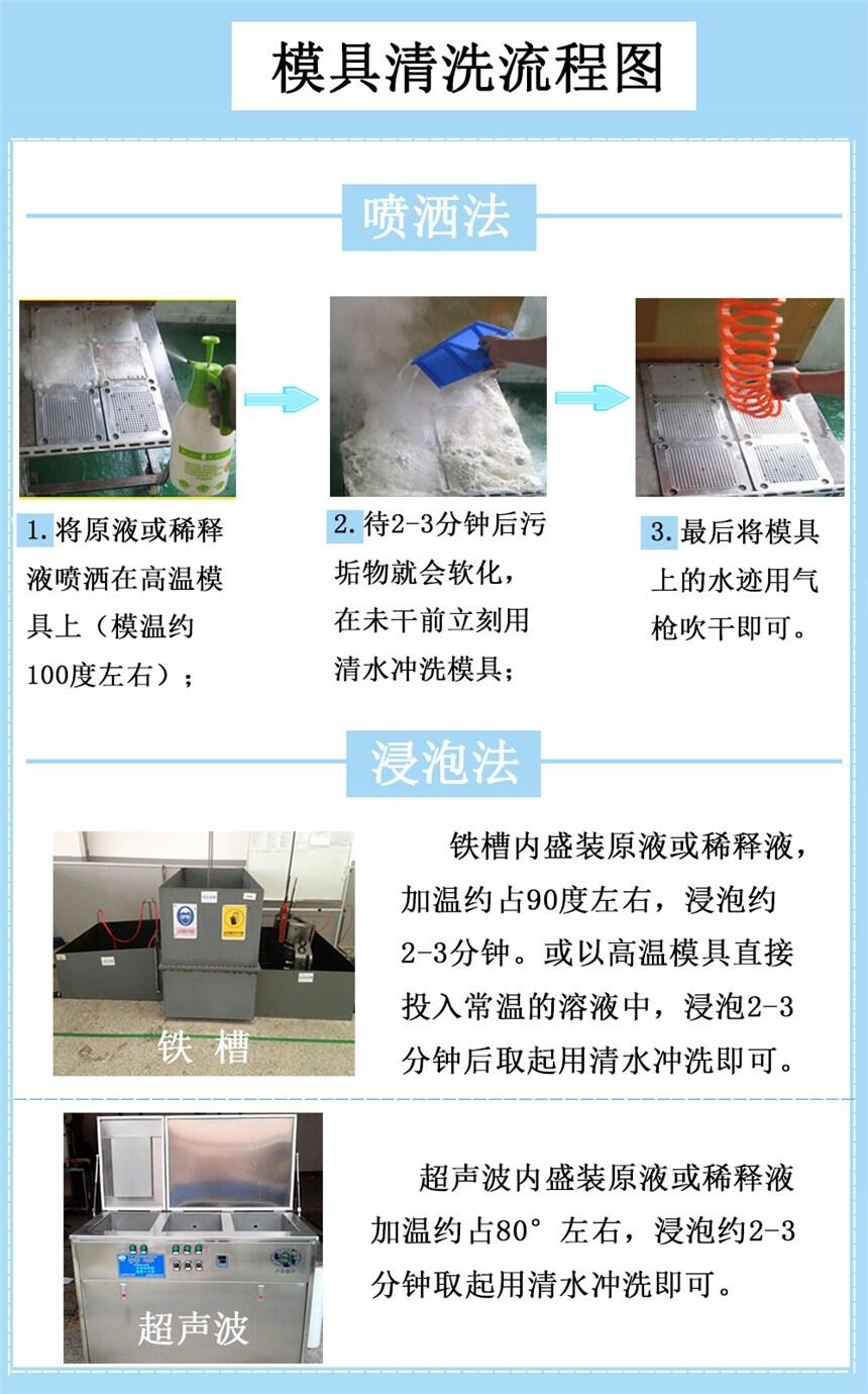 2、浸渍法:铁槽内盛装原液或稀释液,直接将模具,投入常温的洗模水溶液中,浸泡15-20分钟后取起用清水冲洗即可。