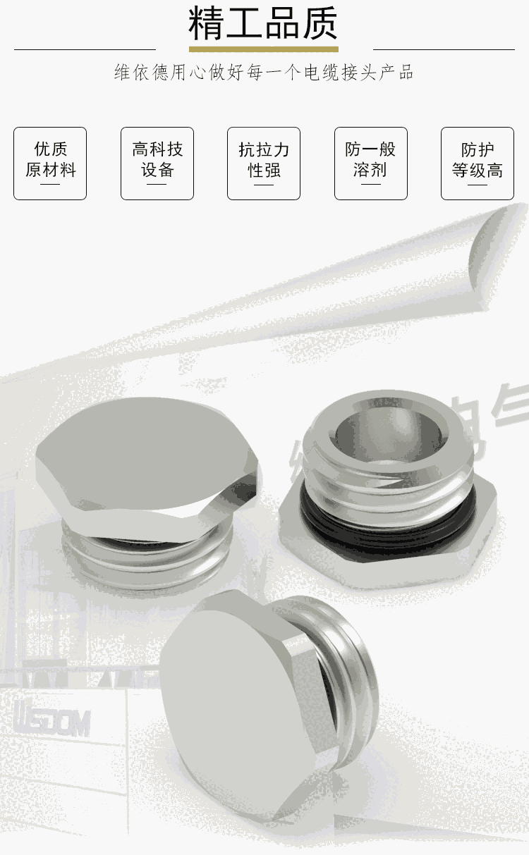 昆山维依德配线器材有限公司,专业wisdom品牌不锈钢防水接头,不锈钢防水接头,尼龙电缆固定头,铠装防爆格兰头生产商,专注研发与生产,优良的设备,精湛的设计,让您体验高品质的防水接头产品,维依德让电气连接更完美。公司主要是集产品研发、生产、销售和技术服务于一体的高科技企业,是当今中国配线器材的主要生产厂家之一,始终专注于品牌电缆防水接头的自主研发和品牌建设,目前主营产品已拥有:不锈钢电缆防水接头,铜防爆电缆防水接头,尼龙电缆防水接头,铠装防爆格兰头,浪管与浪管接头,软管与软管接头,以及其他配线器材等,产品均已通过IP68,ROHS,CE,UL,EX等认证,另具有造型优美,抗拉力强的优点,被广泛应用到了机床、轨道交通设备、风力发电设备、港口设备、烟草设备、工程机械、塑料机械、自动化仪器仪表、灯具、电梯、电机马达、中央空调等各行各业,产品远销国内外。