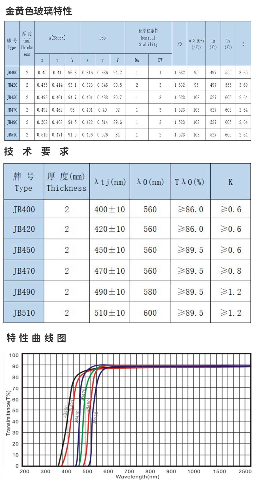 黄色截止型玻璃也称为金黄色玻璃,以JB命名,把它们的透过界波长数值作为序号,表示λ为490nm的金黄色玻璃,
