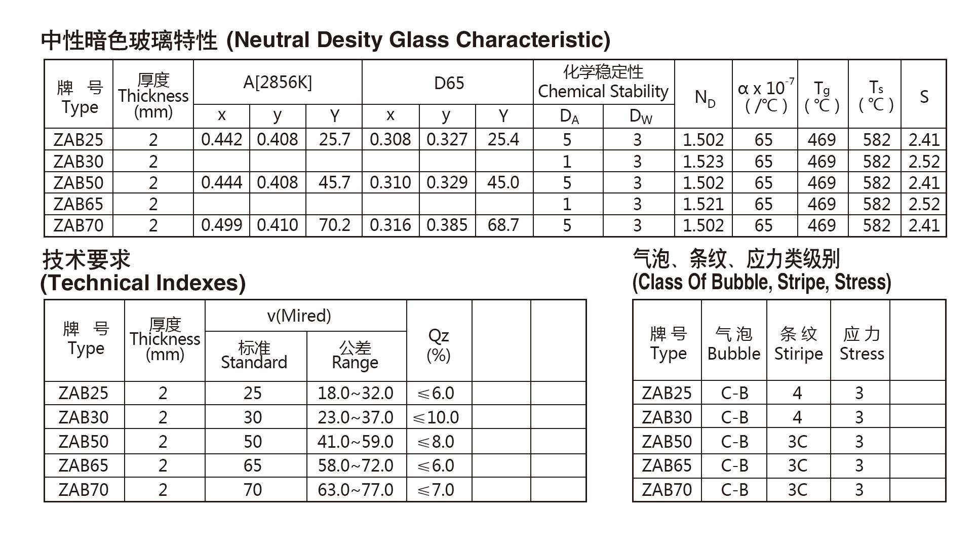 中性玻璃的牌号:AB00、AB02、AB2、AB5、AB10、AB25、AB30、AB50、AB65、AB70