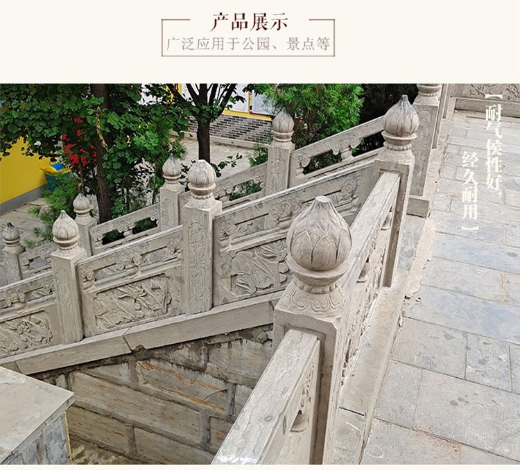 ? ? 石材栏杆有天然大理石、汉白玉、天青石、花岗岩等石材雕刻制作,造型多样。石雕内容丰富如麒麟献宝、龙凤呈祥、八仙过海以及梅兰竹菊、鲤鱼跳龙门、荷花牡丹等题材,可谓美观大方让人留恋忘返,是耸立村口、景区、商业街的常见建筑。嘉祥石雕厂家加工定做汉白玉石栏杆、大理石护栏、建筑护栏。可根据需求加工浮雕图案,现场测量上门安装。我厂制作的石雕栏杆良好、合理,欢迎来厂考察 。传统文化中石雕栏杆意义,到了近代依然是中式园林中的元素。