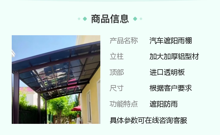 停车篷功能特点 | 遮阳防晒 防雨防水防风稳固 | ||