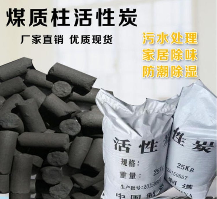 煤质黑色圆柱状活性炭,不定形煤质颗粒活性炭,又称破碎炭。圆柱形活性炭又称柱状活性炭炭,一般由粉状原料和粘结剂经混捏、挤压成型再经炭化、活化等工序制成。也可以用粉状活性炭加粘结剂挤压成型。具有发达的孔隙结构,良好的吸附性能,机械强度高,易反复再生,造价低等特点;用于有毒气体的净化,废气处理,工业和生活用水的净化处理,溶剂回收等方面。
