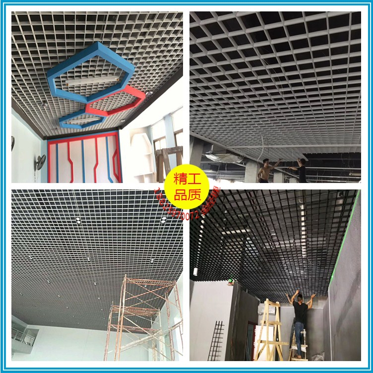 粤艺佰铝格栅天花根据款式不同一般分为方格格栅天花及三角形(菱形)格栅天花,方格格栅天花是目前市面上采用最多的一种款式。格栅天花吊顶系统分为格栅主骨和副骨,格栅主骨及副骨均为特制金属空腹板条。标准为10mm或15mm,高度有35mm、50mm和80mm可供选择。铝格栅格子尺寸分别有100X100、150X150、200X200可供选择。铝方格格栅天花颜色通常为黑白灰及木纹色,也可根据要求定制其他色彩。同时方格格栅的主副骨根据不同要求可定制不同的尺寸,常规的主副骨格栅条侧面高度为35-80mm,格栅条的材料厚度为0.3-0.6mm、根据不同吊顶场所及设计要求,合理选配合适的材料料厚度及方格大小,兼顾吊顶效果及经济性。铝格栅吊顶粤艺佰黑色铝格栅 150x150铝格栅