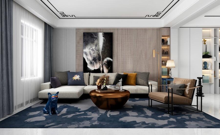一般沙发背景墙,用木饰面铺满或者两侧对称,素雅的木饰面,配合富有艺术感的画,给这个空间增添了许多韵味。