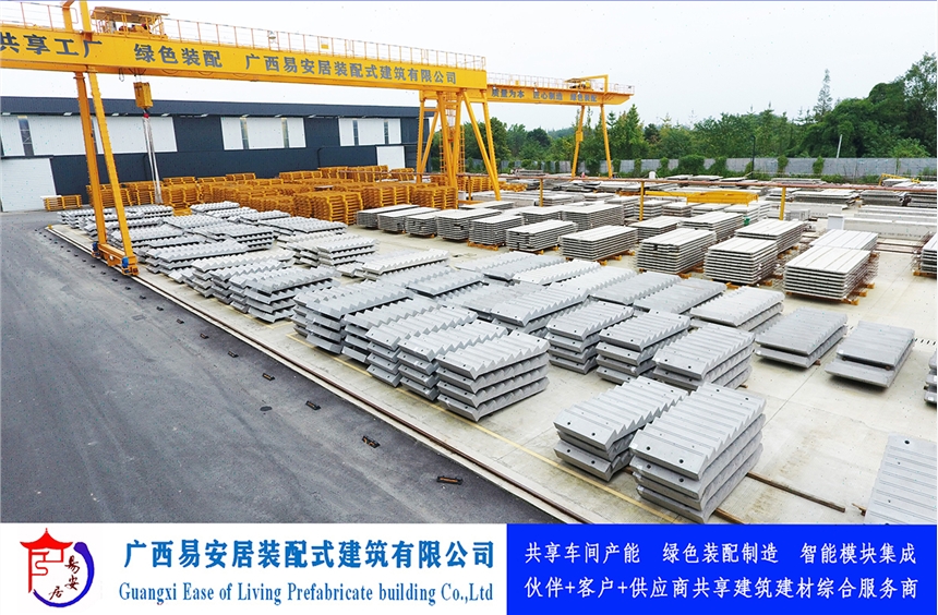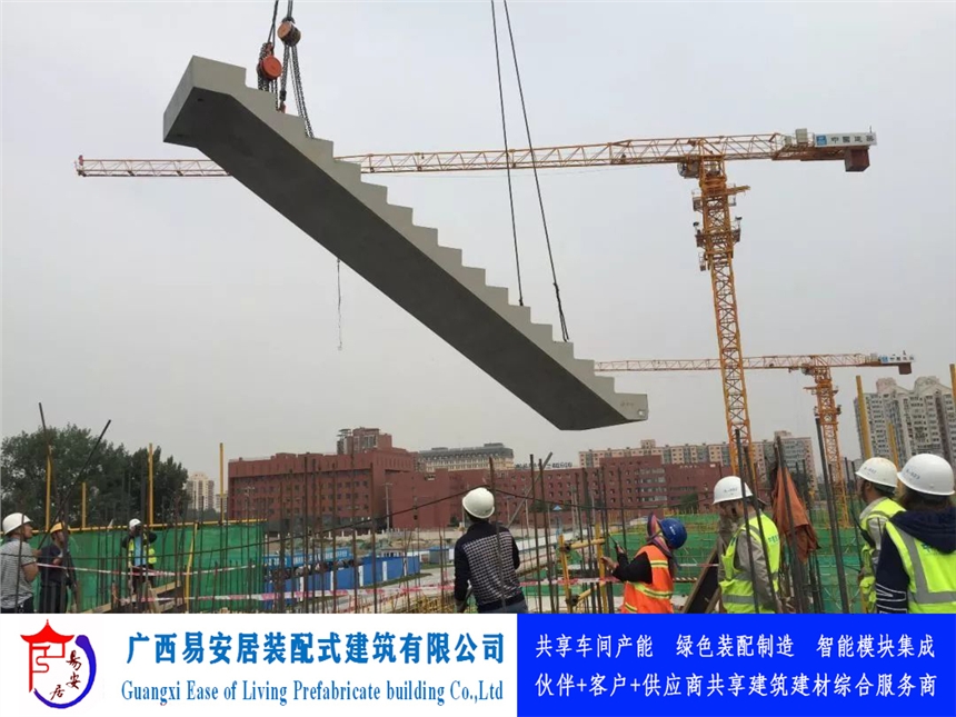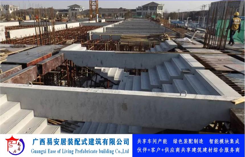 广西易安居装配式建筑有限公司GB/T562-2018规范要求,在2020年推出第二代预制装配式钢筋混凝土楼梯。第二代预制装配式楼梯支座采用一端铰链一端滑动的连接形式,减少楼梯刚度对主体结构产生的不利影响。预制楼梯安装快捷,与传统的现浇楼梯相比省去了大量模板支撑、钢筋绑扎、混凝土浇筑工作量,现场仅需吊装就位,进行简单的拼缝处理即可。节约工期及成本 ;同时吊装完成后可作为施工上下通道。预制楼梯表面平整度、密实度好,具有清水混凝土的艺术效果,楼梯自带面层及防滑条,免去后期面层处理,配套采用成品组装栏杆安装快捷可靠。预制楼梯工厂提前预制生产,现场安装质量、效率大大提高、节约了工时和人力资源的浪费。安装后一次完成,无需再做饰面,清水混凝土面直接交房,外观好,结构施工阶段支撑少易通行,生产工厂和安装现场无垃圾产生。