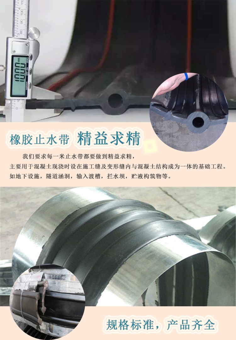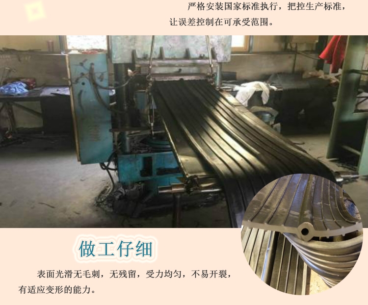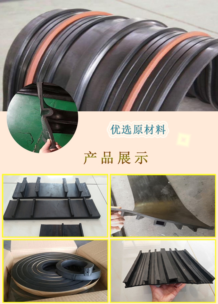 武汉可注浆式橡胶止水带 蝶形工程橡胶止水带根据使用情况又可分类为中埋式橡胶止水带和背贴式橡胶止水带。该止水材料具有良好的弹性,耐磨性、耐老化性和抗撕裂性能,适应变形能力强、防水性能好,温度使用范围为-45℃~+60℃。当温度超过70℃,以及橡胶止水带受强烈的氧化作用或受油类等有机溶剂侵蚀时,均不得使用橡胶止水带。变形缝用背贴式橡胶止水带以天然橡胶与各种合成橡胶为主要原料,掺加各种助剂及填充料,经塑炼、混炼、压制成型,其品种规格较多,有桥型、山型、P型、U型、Z型、乙型、T型、H型、E型、Q型等。