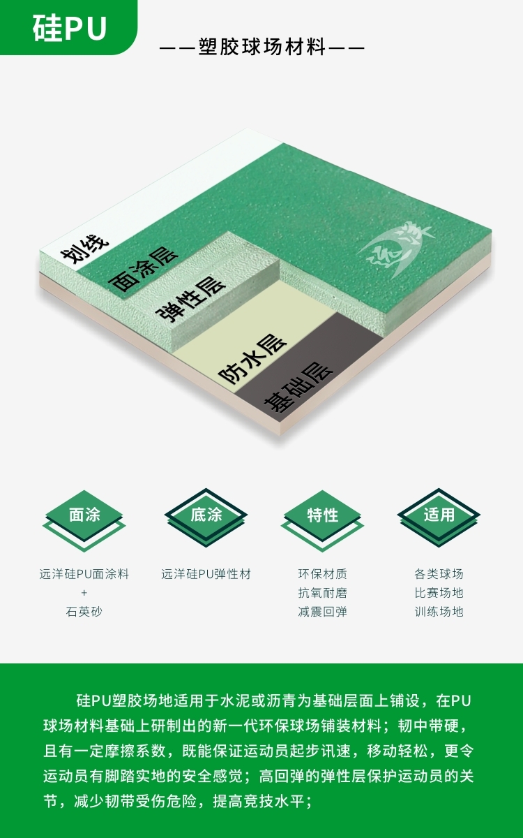 硅PU球场材料是在PU球场材料的根底上开发研制出来的新一代球场铺面材料。该材料是以聚氨酯(PU)与含有有机硅成份的材料科学地复合在一同,所消费出来的材料用在球局面层上,从基本上有效地处置了PU球场材料在环保施工、运用寿命、日常维护等方面的缺少,具有反动性的立异功用。