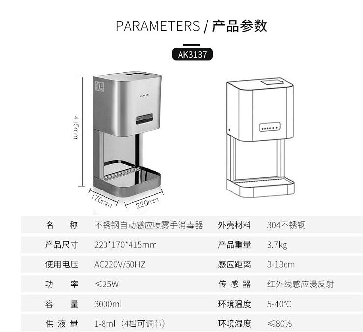 AIKE艾克 进口不锈钢全自动感应净手器酒精喷雾式手消毒器AK3137