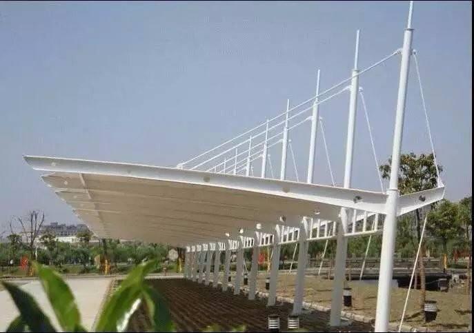 膜结构停车棚,自重轻,具有良好的受力特点——成为大跨度空间结构的主要形式之一。停车场的规划和建设成为现代城市规划的重要组成部分,在以后的建设里会变得越来越重要。膜结构轻巧、别致的造型在停车场及候车厅的建设中担当了重要角色,除了满足防风雨、防日晒等基本功能外,并有较好的标识招揽效果,展现了人们个性化一面。