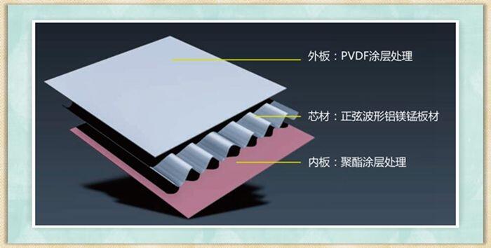 铝瓦楞板6mm厚,比重为4.3k g/m2。由于面材重荷载小,而结构支承龙骨可减少,更具有经济性。