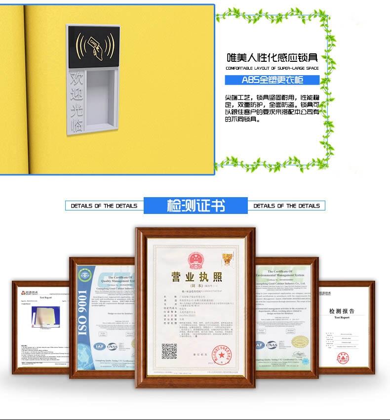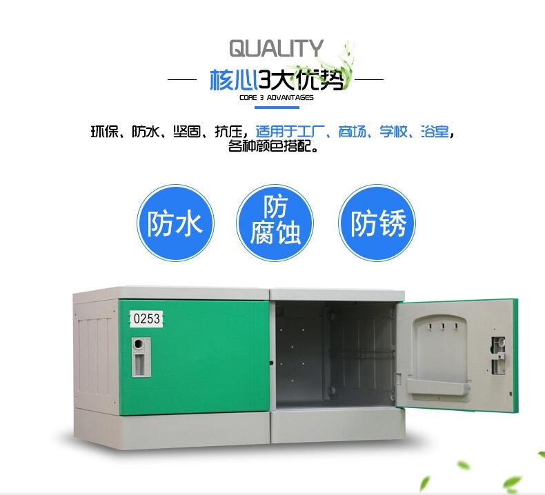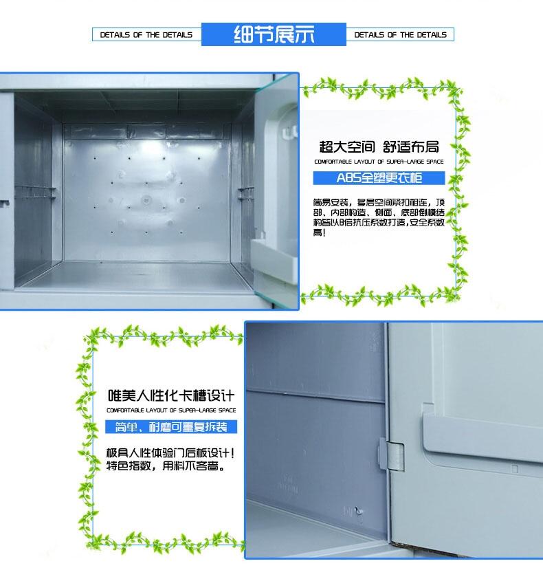 1材?? 质:更衣柜为ABS全新工程塑料制成,强度高、韧性好、耐冲击,不易腐蚀、,无毒无味,环保耐用。