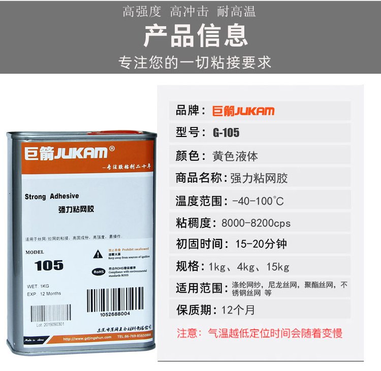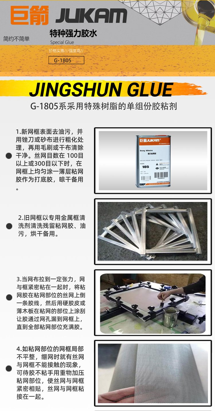 用途范围 | 涤纶网纱,尼龙丝网,聚酯丝网,不锈钢丝网与各种木材,金属(铝、钢、镀锌铁等)网框的粘结 | ||