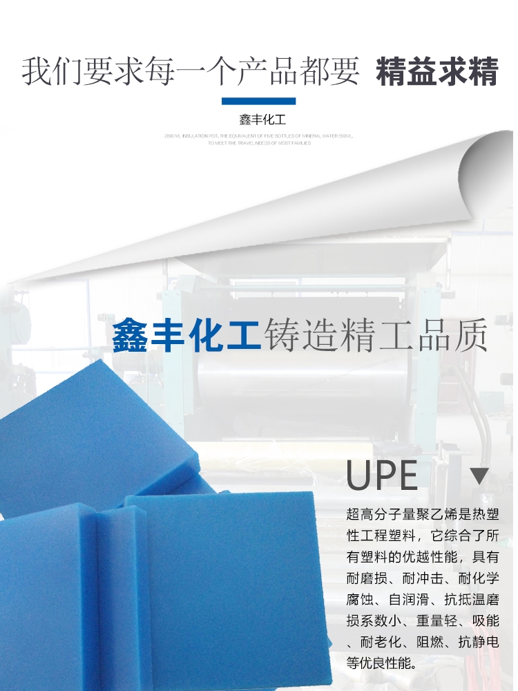 宁津县鑫丰化工有限公司主要生产加工UPE超高分子量聚乙烯板pe棒、pe板、托辊、吊车腿垫板、双色板、兴升起滑块、旱冰场地板、挡煤板 、煤仓衬板、链条导轨、路基板、护舷贴面板、upe异形件;HDPE高密度聚乙烯板材、棒材、车厢滑板、食品级菜板菜墩异形件加工定制;PP聚丙烯材板、棒材、水箱;PU聚氨酯制品;PA尼龙制品;PTEF聚四氟乙烯制品;PEEK聚醚醚酮制品;MG工程塑料合金等产品,公司采用国内超大型液压设备2台,对产品进行加工确保高分子材料的结构充分链接,挤出设备4台,小型液压设备6台,进行各种异形产品的加工,利用数控车洗刨数台对产品进行精细化机加工。公司拥有完整、科学的质量管理体系。宁津县鑫丰化工有限公司的诚信、实力和产品质量获得业界的认可。欢迎各界朋友莅临参观、指导和业务洽谈。