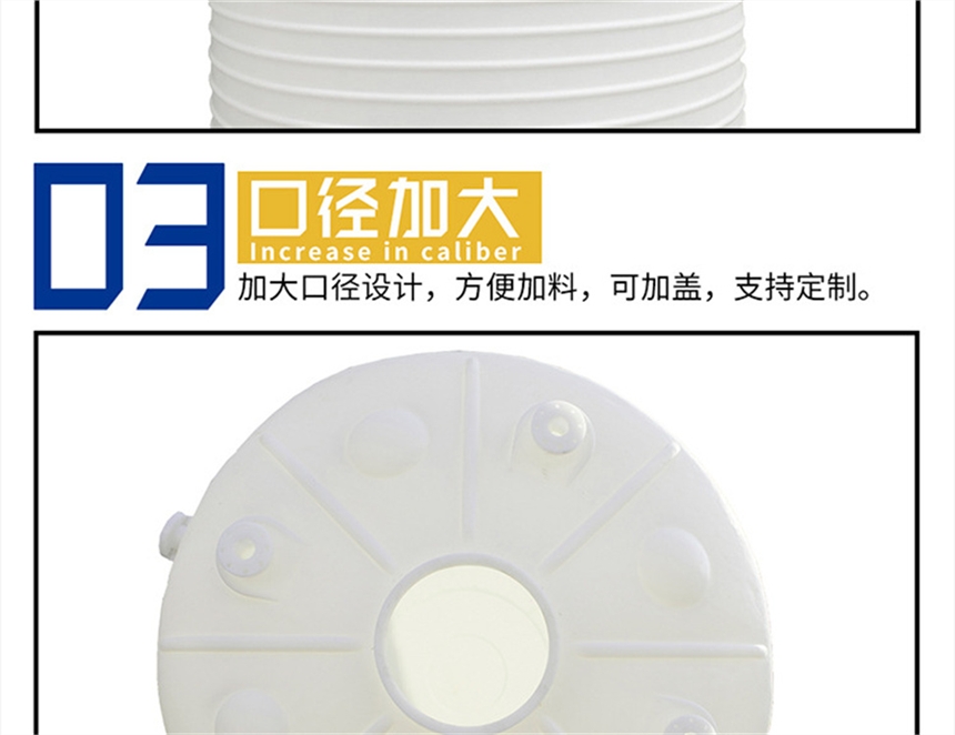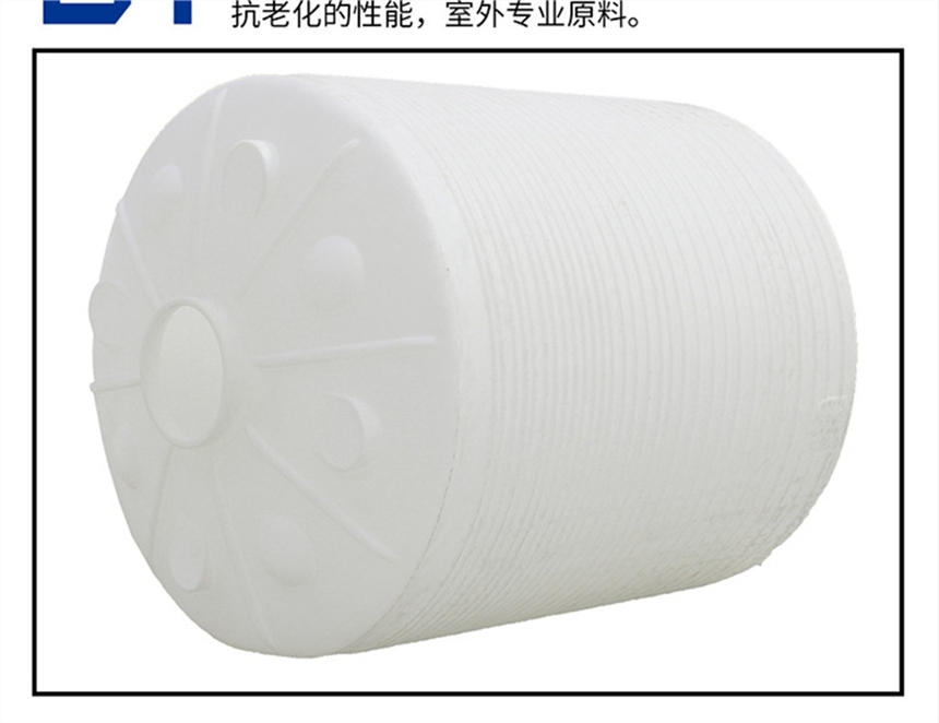产品特性 1、质地坚韧:采聚乙烯LLDPE主要原料,质轻坚韧,搬运简便,耐震、耐冲击。 2、耐药性佳:对各类酸、碱具有抗腐 性。 3、清洁美观:外形流线美观不易脏污,可轻易 去除污垢。 4、经济耐用:桶体一体成型无粘接处,不易破裂。 5、耐热耐冻:耐热耐冻性佳,摄氏80~-40均可使用。 6、不漏液:出水口接头使用与桶体相同材质,采热融接合法加工,可永远省却有漏液的麻烦。 塑料储水罐,滚塑一体成型技术而成,其形状接近矿水泉瓶子,上下有四个供加装接头的平台提供使用者在实地使用时根据自己的需要加装法兰,PVC接头等; 和矿泉水瓶底部一样,围绕瓶底中心的周围有旋转排列凹痕,主要作用为增加桶身强度,防止运输途中振动,防止底部被水压导致变形或破裂,而且装溶液更有稳定性,因此,储罐放置处,请清除尖锐的物品或石块,10吨及以上储罐必须在底部铺细黄沙垫衬底部。 水箱产品常用名称:塑料水箱、PE水箱、PE桶、蓄水箱、储水箱、PE储罐、塑料储罐、清洗水箱、